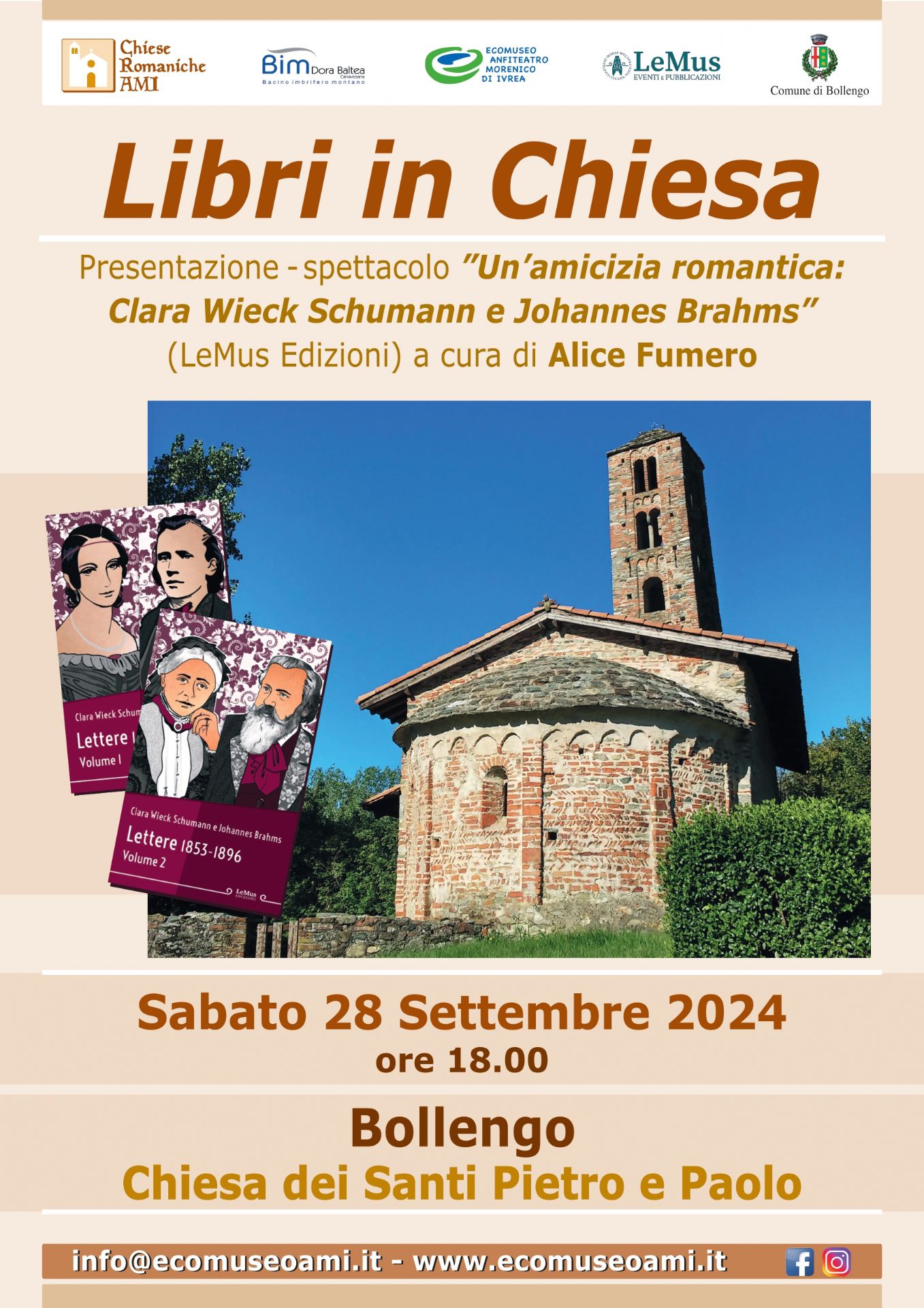 Sabato 28.09.2024 alle ore 18.00 presso la Chiesa dei Santi Pietro e Paolo di Bollengo verrà presentato il libro "Un'amicizia romantica: Clara Wieck Schumann e Johannes Brahms" (LeMus Edizioni) a cura di Alice Fumero.